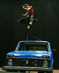 Heel wat minder pretentieus was gelukkig Joplada van Joppe Wouters, een jonge afgestudeerde van de ESAC-circusschool in Brussel. Het is een rasechte street-act, die een massa volk een half uur kan boeien. In zijn Ladajeep komt hij de speelplek opgereden, vreselijk traag en grimassen trekkend. Als een sjofele clown vraagt hij zich telkens af wat met de wagen aan de hand is, want de muziek stopt zo maar, of de claxon gaat, enzovoorts. Op, onder, in, voor, en achter de wagen springt en kruipt Wouters, maakt hij zijn salto’s en schroeven. Leuk en verassend, pretentieloos: gewoon een amusante straatact brengen, met veel clowngehalte en gedurfde sprongen. Meer hoeft dat soms echt niet te zijn.