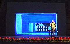 Vertolking en regie. “Marathon” wordt gespeeld door Leon Voorberg in een regie van Paul Mercelis, die een aantal componenten uitvergroot. Zeer belangrijk is de vormgeving (Wouter Feyaerts; Hugo Bergs), de omkadering waarin de acteur op de loopband loopt en acteert. Gedurende de hele voorstelling worden videobeelden geprojecteerd op een groot scherm achter de acteur. Wat getoond wordt is zeer verschillend en associatief bedoeld. Wat je ziet valt niet noodzakelijk samen met wat de acteur zegt en hoeft ook niet samen te vallen. Het beeldenmateriaal dat getoond wordt verwijst naar oorlog (Irak?) en tegelijk naar huiselijke gezelligheid, naar natuur en beschaving zowel als naar de vernietiging er van. Je neemt er als toeschouwer van mee wat je wil en je maakt, met de lopende acteur op de voorgrond, een eigen verhaal. De meerduidigheid van het project wordt bovendien nog versterkt door de muziek en de zang die Jef Mercelis uitvoert. In dit samenspel van groot beeld, licht, ruimte en klank lijkt Leon Voorberg opeens een kleine pion. In een groots universum neemt hij je op sleeptouw en fascineert niet alleen door zijn sterke fysieke prestatie. Helder en rustig debiteert hij een de tekst die in flarden als vanuit een oertijd komt aangewaaid maar niettemin na afloop heel wat herkenning oproept.