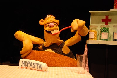 ‘Pssst’, zegt de kleuterjuffrouw tegen de kinderen, ‘stil zijn, de man slaapt. Hij snurkt, hoor je?’ De kleintjes kruipen op de stoelen, de dikke pop blijft snurken, en het hondje kwispelt af en toe in zijn slaap. De zaallichten gaan uit, de dag in de kamer op het podium begint. En de man en het hondje trekken alle aandacht naar zich toe. De kleintjes wiebelen heftig hun beentjes.