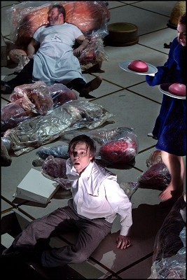 Foto: (c) Phile Deprez | Je vreet je vol en dan ga je dood. Dat is, kort door de bocht, de plot van La grande bouffe, zowel van de film uit 1973 als de theaterbewerking uit 2010. Je kunt het als de ultieme karikatuur van de kapitalistische samenleving zien. Of als de ultieme daad van zinloosheid. Of als een ode aan de decadentie. Of als een boertig verhaal over vier dwaze mannen. Een duidelijker antwoord krijg je niet. Dat is en blijft tegelijk het intrigerende en het frustrerende aan het hele schrans-je-dood-verhaal. Vier succesvolle mannen (een televisiemaker, een chef-kok, een piloot en een rechter) komen samen in een luxueuze villa om zich met behulp van de meest exquise gerechten de dood in te eten. Ze krijgen daarbij het gezelschap van een onderwijzeres en een prostituee (meerdere prostituees in de filmversie). Redenen geven ze niet. Op het filmfestival van Cannes in 1973 zorgde La grande bouffe van de Italiaanse cineast Marco Ferreri voor een waar schandaal. De bewering dat zijn film allerminst een aanklacht was tegen de consumptiemaatschappij maakte de verontwaardiging niet minder. Maar waarschijnlijk is net die weigering om met een duidelijk standpunt te komen, die La grande bouffe een cultstatus heeft bezorgd. Datzelfde ‘waarom’ is ook wat Johan Simons ertoe heeft gedreven om er zijn laatste productie bij het Gentse theaterhuis aan te wijden. Liever dan zijn eigen oplossing in zijn stuk te projecteren, hevelt hij zijn vragen over naar het publiek in de zaal. Kort na het begin van de voorstelling dondert een heel slachthuis aan in plastic verpakt (nep)vlees uit de lucht het podium op. Het is een truc die Simons enkele seizoenen geleden al toepaste bij Platform, toen het op de scène een ontploft hotelinterieur regende. De verrassing is dus minder, maar toch werkt de ingreep ook dit keer nog. De chaos van kunststofvlees vormt het decor waarin de mannen hun organen een na een de vernieling in eten. Johan Simons blijft vrij trouw aan de filmversie. Dialogen en plotwendingen komen vaak letterlijk uit het filmscript. Om het verhaal aan te passen aan de theatertaal, voert hij voornamelijk twee grote ingrepen door. Eerst en vooral eet in de theater-bouffe niemand een hap. Al het eten is nep (een vraag naar wat nog echt is in een bestaan dat ze als zinloos ervaren?). De overvloed wordt vooral voelbaar door de verfijnde recepten die Wim Opbrouck (kok William) geregeld in het rond strooit. In het begin van de voorstelling loopt het water je in de mond. Op een gegeven ogenblik heb je echter genoeg. Puur door zijn woorden, bezorgt Opbrouck de toeschouwer ternauwernood een indigestie. De verbeeldingskracht van het theater wordt op de spits gedreven. Simons presenteert zijn bewerking als een reconstructie. Dat is de grootste ingreep die de regisseur in het oorspronkelijke materiaal doet. De onderwijzeres Elisa (Elsie De Brauw) en de prostituee Christiane (Chris Nietvelt) vertellen retrospectief wat er dat weekend in de villa is gebeurd. Op hun wenken vallen de heren dood neer of komen ze weer tot leven om een nieuwe herinnering uit te spelen. Daarmee plaatst Johan Simons het perspectief van de vrouwen voorop. En hun interpretaties verschillen danig van elkaar. De onderwijzeres bewondert de mannen met een hysterisch enthousiasme en zal hen tot het eind stimuleren om ermee door te gaan: “Dit is wat ze willen bereiken, Christiane! Dit is superieur!” roept ze de ander toe. Christiane kan de decadentie, de verspilling en de neergang van de mannen niet aanzien. Ze klaagt ze aan en verlaat het gezelschap uiteindelijk. Net in de context van dit verhaal dat weigert antwoorden te bieden, zijn deze verschillende perspectieven interessant. Ze stellen de waarom-vraag centraal in de voorstelling, en gaan samen met het publiek op zoek naar antwoorden. Of je als toeschouwer al dan niet met zo’n antwoord op de proppen komt en wat voor antwoord dat dan wel moet zijn, hangt volledig af van je eigen kijkervaring en de interpretatie die je zelf in het stuk wil leggen. Een toeschouwer die deze denkoefening niet maakt, blijft steken in de oppervlaktelaag van het stuk en komt van een koude kermis thuis. Eten, boeren, winden laten en vrijen. Dat is wat het gezelschap smulpapen doet. Het werkt aanvankelijk op de lachspieren, maar op de duur ook op de irritatiegrenzen. De voorstelling blijft echter niet steken in dit niveau. Daarvoor voel je je na afloop te ongemakkelijk. De vier heren zijn in de ogen van de maatschappij waarin ze functioneren meer dan geslaagd. Ze hebben succes, staan hoog op de sociale en de economische ladder. Waarom willen ze dan per se dood? La grande bouffe laat je zitten met vragen die zich neigen te centreren rond zinloosheid, maar ook rond het leven, de maatschappij en waar we daarmee naartoe gaan. Dicteren doet de voorstelling niets. Heel precies kun je er de vinger dus niet op leggen. Maar het voedsel-thema draagt ongetwijfeld bij tot het onbehagen. Enkele seizoenen geleden studeerde de Toneelklas van Dora van de Groen, editie 2006, af met Peter Handkes Publikumsbeschimpfung. Een theaterpubliek choqueren met woorden, zoals dat in de jaren zestig gebeurde, bleek begin eenentwintigste eeuw nauwelijks nog mogelijk. Door een rijkelijk geurend en ogend buffet op de grond te keilen, lukte het wel. La grande bouffe speelt in op eenzelfde mechanisme, al tilt Johan Simons de verspilling naar een abstracter niveau. Het is niet zozeer de seks in de voorstelling die ons doet denken. Te veel en te goed eten aan de ene kant, verkwisting aan de andere, dat is iets wat de hedendaagse westerse mens blijkbaar provoceert tot nadenken over zijn bestaan. Precies door die provocatie gaat La grande bouffe over meer dan over vier decadente heerschappen die zich volproppen en sterven. La grande bouffe wordt op die manier wél een aanklacht tegen overmatige consumptie en alle uitwassen die daarmee gepaard gaan. Alleen ligt de aanklacht vooral buiten de voorstelling: ze zaait een kiem van onbehagen in de hoo