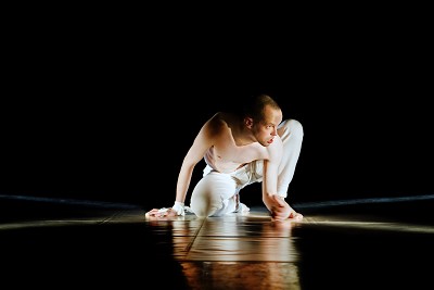 Het opvallendst in deze productie is misschien nog het belang dat het collectief aan beelden hecht. De scenografie is sober en stelt – vooral met behulp van een strakke belichting – de spelers centraal. Drie mannen met geschoren hoofden en ontbloot bovenlijf vormen misschien geen vanzelfsprekend, maar wel een uiterst krachtig beeld voor deze jeugdtheatervoorstelling. Vanuit hun fysiek beginnen ze het verhaal te vertellen. Koen Monserez speelt dokter Gachard, die Dauphin bevrijdt en hem opvoedt tot prins. De acteurs en de muzikant verwerken choreografische bewegingen tot een vormelijk en beeldend zeer sterk geheel. In het begin zit Dauphin nog helemaal alleen in zijn kelder. Er zijn enkel twee diagonale lichtbundels die elkaar centraal op het speelvlak kruisen. Dauphin zit daar maar wat te zitten, een klein en eenzaam figuurtje, een jongen die geen normale jongen kan of mag zijn, die het moeilijk heeft met woorden. Na een tijdje begint hij op handen en voeten in de diagonalen van het licht rond te lopen. Zijn gangetje doet denken aan Mowgli die achter de olifanten aan loopt. Ondertussen staan Stefan Wellens rechts van het speelvlak en Koen Monserez links. Ze zijn gewapend met een arsenaal aan instrumenten en microfoons. Wellens speelt en Monserez begint te spreken: een soort monologue interieur van de jongen. De woorden die Dauphin spreekt, zijn aanvankelijk misschien beperkt, maar zijn gedachten zijn vloeiend en poëtisch: ‘Waarin ik vastzit, ben ik zelf. Een kelder zonder trap, deur of raam. Waarin ik vast zit, ben ik zelf. Een prins zonder eigen eigennaam.’