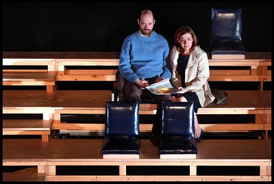 Niet zomaar ziet regisseur Johan Simons het kerkhof als een tribune waarvan de zitjes de graven suggereren, waar de man en de vrouw nu eens naast, dan weer ver van elkaar gaan zitten, iets eten en drinken. Het kerkhof krijgt iets huiselijks. Ze kunnen elkaar iets aanreiken, een handje toesteken. Vroeger is even terug. Het gekibbel, de kleine steken onder water, het toegeven en het loochenen. Bovendien is het een draaibare tribune. Zoals de wereld draait en de natuur regen en storm voortbrengt, is ook het leven gekenmerkt door gevoelswisselingen al verandert er in een mens daardoor blijkbaar zeer weinig.