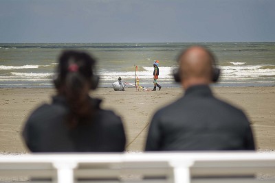 Festivals zoals Theater aan Zee lenen zich uitermate voor de creatie van locatievoorstellingen. De familievoorstelling Appelblauwzeeziek (10+) van Kopergietery heeft wat dat betreft op de afgelopen editie de locatie der locaties uitgekozen. Op een afgelegen stukje strand namen de toeschouwers plaats op een lange witte bank, allemaal naast elkaar, met een koptelefoon op de oren, een minuscule verrekijker in de aanslag en eventueel een deken op schoot. Voor je: het strand en de nauwelijks merkbaar dichterbij sluipende Noordzee (de voorstelling werd alleen gespeeld bij vloed). Dichtbij de waterlijn staat een man (Tom Ternest) in een vormeloze, zilverachtige regenjas. Hij staat met de rug naar het publiek en staart naar de zee. Die zee ruist zachtjes in de oren van de toeschouwers. Het is een kanjer van een beginbeeld. Meer heb je niet nodig om een rilling over je rug te voelen. De kleine, eenzame figuur bij het weidse water raakt zonder woorden en werpt je terug op jezelf.