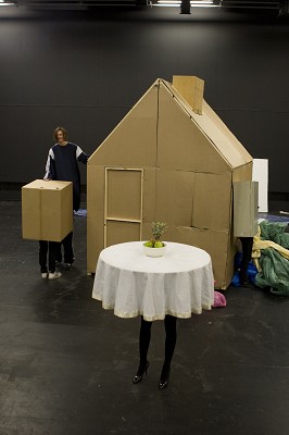 (c) Reinhout Hiel | Grappig is Springville, maar ook bizar. Na haar doorbraak op Theater Aan Zee, in 2004, met de ingetogen installatie Huilend Hert/Aangeschoten Wild, na de afmattende muziekperformance Sportband/Afgetrainde Klanken en de verzameling acties, installaties en performances Grote Hoop/Berg, wekt Miet Warlop met dit recentste werk – pas nog hernomen op het Theaterfestival – haar fascinatie voor objecten en de stille film opnieuw tot leven in een kleurrijk en intrigerend theateruniversum. Ze staat zelf op scène, naast Katja Dreyer, Sofie Durnez, Arend Pinoy, Seppe Baeyens en Laura Vanborm. Maar dat zie je niet in de voorstelling. Op Pinoy na ondergaan de performers een bijzondere metamorfose. Springville toont de opeenvolgende wederwaardigheden van een man in groen kostuum, een kortsluitende zekeringkast, een kartonnen doos met een slurf, een jogger van tweeënhalve meter en een tafel op hoge hakken. Tegen de achtergrond van een wankel huisje en een opgevouwen streep plastic, komen de personages op, interageren en vallen een voor een dood. Zonder tekst. Zonder uitleg.