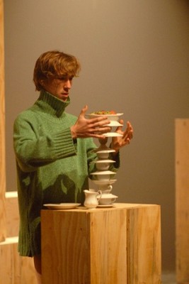 Houten kisten en kasten in allerlei formaten staan op het podium. Een jongen ( Simon D’Huyvetter) met guitige snoet en in een groene slobbertrui kijkt beteuterd als er uit zijn cd-speler geen geluid komt. Hij gaat op zoek naar de oorsprong: de stekker is niet ingestoken. Het wordt een zoektocht in de kasten naar een verlengkabel. Spannend is het, want uit een kast komt er vanzelf plots zo'n aansluiting. Zit er iemand in? Want we zien toch een vinger bewegen? Eindelijk kan de cd-speler aangesloten worden en klinkt er muziek. De jongen straalt, maakt wat danspasjes, maar dan rammelt het in de kast. Er wordt serviesgoed aangesmeten: kopjes, schoteltjes vliegen door de lucht, zelfs een bezem om scherven op te ruimen. Een bordje aardbeien is het sluitstuk. Uit de kast verschijnt zij (Sanne Haenen) in een zwarte slobbertrui. Er ontspint zich een dansant bewegingsspel van aantrekken en afstoten tussen de twee, ze verdwijnen in elkaars truien, ze dagen elkaar uit. Wat de een kan, wil de ander ook, en vice versa. Het wordt een suggestief woordeloos dansspel van ontmoeten en uit elkaar gaan, in pure eenvoud, en in een afwisseling van hoog slapsticktempo en trage abstracte dans. Poëtisch en humoristisch glijdt het ene beeld in een spitse timing associatief organisch over in het ander. Het is voor jong en oud een veertig minuten geboeid blijven kijken. Fantastisch in al zijn beeldende en bewegende betekenissen.