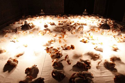 Er wordt verteld dat Franz Kafka tranen met tuiten lachte als hij in gezelschap uit zijn werk voorlas. Iets wat je niet direct zou verwachten van de schrijver van het bekende zware en sombere proza. En toch kan ik het me voorstellen. In zijn verhalen belandt een personage vaak buiten zijn wil in een ondoorgrondelijke en uitzichtloze situatie. Ook vaak een absurde situatie: iemand die plots in een kever verandert, iemand die onder de grond leeft of piept als een muis. Een rare situatie die in eerste instantie toch gegrinnik opwekt. Meestal raken de personages niet uit hun situatie, wachten ze wel op een uitkomst, maar op de duur kennen ze hun einddoel niet meer, en weten ze niet meer waarop ze wachten. Het blijft maar wachten – maar waarop? Het is zo verstikkend, dat lachen bijna de enig overgebleven remedie wordt. Wat moet je anders doen? Zeker als buitenstaander (zo’n buitenstaander als de verteller en de ook de lezer er één zijn). Er zullen geen lachsalvo's weergalmen, wel wat fijne lachjes met en om het onhandige gedoe aan de oppervlakte van een put tragiek. Eerste ruimte: projecties van een vrouw en een man die wachten, en wachten. Ze staan daar maar, als deftig geklede Adam en Eva in de twee zijluiken van een triptiek waarvan het middelste deel ontbreekt. De verveling zet hen in beweging. Ze blijven voor zich uit staren. De man en vrouw kronkelen in hun benarde ruimte, traag, staan op hun hoofd, zitten in een knoop. Heel zielig, maar ook grappig om te zien. Daarmee is de toon gezet van de negen installaties van het parcours van K, a society. Kris Verdonck liet zich inspireren door het werk van Franz Kafka. Het is geen visualisering van of illustratie bij verhalen van de auteur, maar een zeer geslaagde 'ver-beel-ding' van een wereld naar de 'adem van Kafka's oeuvre'. Als in een doolhof leidt een gids ons in het Engels van de ene locatie naar de andere. Lijzig port hij ons aan om hem te volgen, met de stem van de aalmoezenier uit de documentaire verfilming van het leven van Kafka en Het Proces. De aalmoezenier die de parabel van Voor de Wet vertelt als mogelijke verklaring van de situatie waarin Jozef K. na zijn arrestatie terecht is gekomen. Onze gids vertelt bij een installatie van een grote juten bol een ander verhaal, over het wezen dat Odradek heet. Een wezen als een garenklos dat zich in huizen ophoudt, dikwijls verhuist en meestal onzichtbaar aanwezig is. En als je het ontmoet, zal het hoogstens een lachje vertonen en weer wegwezen. De wereld als een gesloten en ongrijpbaar bolwerk. Een hele rij mensen kijken ons (wat levendiger dan bij Bill Viola) vanaf een lang scherm aan, babbelen onder elkaar, wijzen onopvallend naar ons, roddelen – ja ze roddelen over ons! – ze lachen een beetje, zijn ineens stil, om het geroezemoes en de kletspraatjes weer langzaam aan te vatten. In twee rijen opgesteld, kijken wij naar mensen die ons aankijken, en vice versa, lijkt het. Het is grappig, maar heeft ook iets onvatbaars. Zoals het grote beeld van een stadsgedeelte, waarop heel traag wordt ingezoomd. De spiegeling in het glas wordt heel geleidelijk groter, en dat beeld bevreemdt, ook door de tekst van een vrouw die in losse zinnetjes details beschrijft, daarover mijmert en verder associeert naar haar leven, naar haar zijn, naar een universele existentie in een gefragmenteerde wereld. Het heeft in al zijn schoonheid iets onheilspellends in zich, of misschien wel iets unheimlichs. Zoals ook de ambtenaar in net pak die onder water zijn aktetas stevig blijft omklemmen. Dat beeld roept ook gegrinnik op. Zoals ook de installatie met de zangeres en haar zangers. Zijn het poppen, welke trucage wordt ons nu voorgeschoteld, hoe zit dat technisch met de projectie? Waar eindigt de mens, en begint de machine? Of is het andersom? En kunnen die machinerieën uitgroeien tot muizen-mensenvallen, tot vernietigingsmachines? Heel de machinerie komt heel grappig in actie bij het veld knuffelhondjes. Ze rollen, ze kwispelen, ze blaffen, alleen, in duo, een groepje. Een choreografie van knuffelbeesten met een aanloop en reutelend einde, als een perfecte klassieke tragedie. Een letterlijk in beeld brengen van manipulatie zoals ook het spetterend vuurwerk in een glazen box. We ervaren op onze kriskras-route door de installaties imminente beelden die tegelijkertijd ludiek zijn. Een bijwijlen olijke beklemming, maar het blijft een verdrukkende dreiging. En we ervaren - hoe ambigu ook - een esthetisch genot bij deze ver-beeld-ing van systemen die de mens 'kafkaesk' verdrukken. Met een voldane glimlach ontwaken we als het ware uit een kwade droom. Beknellend was het. Maar ook ongrijpbaar mooi.
