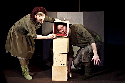 Deze keer wordt ons derde kleinkind in het theater ingewijd! Lasse is nu dertien maanden en zal naar Ha Dede op het Babelutfestijn in CCHasselt gaan. Ira, zijn zus van tweeëneenhalf wuift hem met "Toneel is leuk, hoor" enthousiast uit als moeder en zoon zich op de fiets naar het cultuurcentrum begeven. Hij lijkt er zin in te hebben. Waggelend komt hij me tegemoet gelopen als we hem in de hal opwachten. Daarna begeven we ons tussen de wachtende mensen, dan wil hij wel door zijn moeder opgepakt worden. We krijgen wat uitleg. Mobiele speeltuigjes uitschakelen, en erop letten dat de kleintjes niet op de scène komen. Een man en een vrouw in zacht groen en bruin gekleed verwelkomen ons. De grootouders en een paar vaders en moeders gaan op krukjes op de buitenste kring rond het speelvlak zitten, de kindjes en ouders op de kussens. De spots worden feller en kleuren de blauwe achterwand. Lasse tuurt in het licht. De man neemt een kleine gitaar, tokkelt, de vrouw zingt ritmisch klanken. Kleine kubussen worden gekanteld en gestapeld, rond het hoofd gezet, en de man en vrouw geven de kubussen via het hoofd en de handen aan elkaar door. A capella gezang van klanken zonder woordbetekenis stuwen het ritme. Lasse huppelt en draait heel even met zijn handjes boven zijn bolletje, stopt dan, want er is weer wat anders te ontdekken. Uit een kubus klinkt muziekdoosmuziek, een andere kubus heeft een draaiende vierkante plaat en draait wat later als een tol rond. Uit een poppenkast met een groot gat vallen een na een grijsachtige bollen met een staartje en houten knoop, en uit die bollen verschijnen rode en gele en blauwe neuzenslurfjes. Figuratief en toch abstract. Zoals ook de muziek en het spel met de objecten. Rustige en vertrouwde klanken kantelen in dynamische ritmes. De objecten bewegen, kleuren en dansen mee op het ritme van he gezang en het spel. Herkenbare spelpatronen, verrassende wendingen, die nieuwsgierig maken. Lasse zou dat wel eens van dichtbij willen zien, maar wordt door zijn moeder tegengehouden. Zijn aandacht gaat nu naar de kindjes en de grote mensen rondom. Hij komt zelfs even naar zijn oma, even op de schoot, en dan hops, weer naar voor. Hij gaat liggen, en steunt op zijn armpjes op een kussen en overschouwt het spel. De man en de vrouw spelen met de bollen aan hun voeten en armen, binden ze aan elkaar, maken cirkeltjes. Ondertussen zingen ze klanken in verschillende ritmes. Weer wil Lasse er dichtbij zijn, maar weer komt zijn moeder tussen. Ook andere kindjes moeten regelmatig op hun plaats gezet worden. De meeste kindjes blijven op schoot zitten en volgen. Slechts één peutertje moet stil wenend het zaaltje verlaten. In een rustig muzikaal en visueel spel zonder grote en spectaculaire effecten ontdekken en ervaren de kleintjes en de (groot)ouders een wereld van geluiden, gezang, ritmische bewegingen, van voorwerpen en hoe die uitnodigen tot dynamisch en zacht spel. Rustgevende kunst die tegelijkertijd nieuwsgierig maakt en verrast. Ik heb al een paar keer geschreven over kunst voor baby's en peuters (zie in archief over Babelut, Sprookjes en zo, Pantalone). Kunst voor de allerkleinsten? Waarom niet? Schadelijk zal het zeker niet zijn. Integendeel: het biedt een esthetisch tegengewicht tegen al die piepjes en bliepjes en blikkerende lichtjes in lelijke kleuren, al dat klepperend speelgoed, waar menig peuter onder bedolven wordt, dat met een rechttoe-rechtaan druk op een toets voor eendimensionaal effect zorgt. Hier telt de kunst van eenvoud. Met haar ontelbare fantasie-aanzetten. Dat kan je nooit te vroeg ontdekken. Info: Www.despiegel.com
