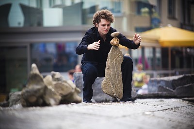 Een aftands wachtlokaal met afbladderende muren in het station van Oostende. Het is onze eerste halte op onze theaterwandeling. Theater aan Zee zet een aantal wandelroutes uit om jong theatertalent aan het publiek te tonen. De Dijknomaden is zo'n route, en wat voor een! We krijgen drie schitterende producties/performances te zien. Liv Laveyne en Sophie De Somere van TAZ hebben een prachtige selectie gemaakt van voorstellingen van Vlaamse en Nederlandse productiehuizen en toneelopleidingen. Een vrouw in donkerblauwe jurk wacht ons op, holt nog snel naar de wc. Een blonde vrouw in lichtblauw jurkje – en echt waar, ze ziet er zeer Hollands uit – komt verlegen het lokaal binnen, plaatst haar koffer, haalt er een kaartje uit, schikt alles, steeds opnieuw, op zijn plaats. De vrouw in donkerblauw komt binnen, de vrouwen zien elkaar, slaken een gilletje, omarmen elkaar, de lichtblauwe wil de donkerblauwe op afstand houden, duwt haar van zich af. De toon is gezet. De lichtblauwe verzamelt theezakjes en is bijzonder trots op haar collectie. Een reuktest moet dat kunnen bewijzen, maar daarin wordt ze belemmerd door de donkerblauwe. Een kopje thee, liefst met een kaakje is het summum van Hollands huiselijk geluk. Of toch liever koffie? (Mijn moeder zei altijd dat je alleen thee drinkt als je ziek bent. Zij was Nederlandse, maar wel van Limburg). De donkerblauwe is vogelaarster en is bijzonder fier dat ze vogels kan herkennen en nadoen. Er ontwikkelt zich een heerlijk hilarisch spel van uitbeelden der vogels. De spanning tussen de dames wordt opgevoerd, de een wil de andere overtreffen in hoeveelheden vogelstandjes en theezakjes. En dat ontaardt steeds meer, tot de dood erop volgt. Eveline Agema en Inge Voskamp hebben de theateropleiding n Zwolle gevolgd, en elkaar gevonden in hun mime- en bewegingstheater. Ze weten in hun mimisch en dansant spel de kleine kantjes der mensen uit te vergroten, op een aandoenlijke manier en goed getimed. De (Hollandse?) kneuterigheid ten top! Als toeschouwer volg je op het puntje van je stoel dit heerlijke spel, word je voortdurend verrast en glijd je mee in de absurde humor. Hoe fascinerend en prachtig mime toch kan zijn! Zo hilarisch Thee is, zo broos en verpletterend is de performance Freeze! van Nick Steur, die dit jaar afstudeerde als theaterperformer aan de Toneelacademie van Maastricht. We kijken naar een aantal spiegelkubussen, die voor de ramen zijn opgesteld. Op de vensterbanken liggen kleine en grote stukken steen in allerlei formaten, door het raam hebben we uitzicht op de dijk en op de zee. Nick Steur in het zwart zegt geen woord, hij zet een iPod op en we horen zijn stem langzaam vertellen. Ondertussen begint hij op een spiegel een aantal stenen te stapelen, niet zoals steenmannetjes uit het noorden die reizigers de weg moeten bakenen, neen, het worden heel eigenaardige constructies, waarvan je je steeds afvraagt hoe ze blijven rechtstaan. Puntige stenen balanceren op elkaar. Heel geconcentreerd is de performer ermee bezig, heel geconcentreerd volgen wij zijn handelingen. Wat doet hij nu? Dat kan toch niet? Hoe speelt hij het klaar? Het is vreselijk spannend. Ondertussen horen we ook de tekst die na een lange aanloop gaat over het verschil in perceptie tussen taal en beeld en over het constant zoeken van de mens naar evenwicht. En hoewel de tekst in het begin heel vreemd aandoet, schuift ze wonderwel perfect in het geheel. Gehoor en zicht vallen samen, balanceren perfect in evenwicht met elkaar. Vol spanning blijven wij naar het balanceren van natuurstenen turen. Af en toe kijkt er een toerist door het venster om te zien wat daarbinnen loos is, maar snel concentreer je je op de stenen. De performer zoekt "een balans tussen de eigen wil en die van de steen." en als toeschouwer word je in dat magische proces meegezogen. Nick Steur heeft al van kindsbeen af natuurstenen in stapeling laten balanceren. Hij hoopt in de toekomst grote rotsblokken in de zee met kranen te kunnen balanceren. Dat moet prachtig zijn, maar Freeze is ook al een pareltje van een performance. Een kleinood in puur evenwicht, om te koesteren, en te koesteren. Een naam en project om nooit meer te vergeten! Als afsluiter van het Dijknomadenproject was er in een lokaal in verbouwing op weet ik welke verdiepingvan een hotel de performance van Nikolas Lestaeghe. Een jonge man (derde jaar RITS) komt met een koelboxje binnen. Hij beweegt ermee, glimlacht er tegen, zegt iets onverstaanbaars, maar het klinkt lief. Hij open een groot geblindeerd raam, kijkt naar buiten, neemt een springhouding aan. Hij gaat weer langs de deur weg, komt terug met vleugels, sjort ze aan. Het is duidelijk, deze jongen wil vliegen. Steeds haalt hij nieuw materiaal, steeds weet hij de toeschouwer te verrassen door zijn fantasie, zijn beelden, zijn naiëve drang om de zwaartekracht te overwinnen, en dat stemt melancholisch. Het eindbeeld geeft de verbeelding totaal vleugels. Ik was enorm ontroerd. Zo eenvoudig, zo puur, zo kinderlijk echt. Meer ga ik er niet over zeggen. Je moet deze knutselaar gewoon theatraal bezig zien. En laat je meedrijven in zijn (pogingen tot) vlucht, en weer buiten kijk je anders naar de lucht. Info: www.theateraanzee.be of www.nicksteur.com