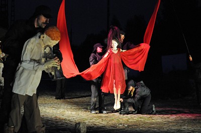 Als we naar het terrein van de broers Perdu gaan, regent het, we krijgen regenjasjes en tijdens de première gutst het nog harder. Maar dat kan de pret niet deren. De spelers hebben er zin in. De muzikanten nog meer, maar die zitten dan ook lekker droog onder het tentzeil. Swingende muziek, met een mengeling van Zuid-Amerikaanse ritmes en slepende blues. Vanachter de struiken komen de acteurs en spelers in het zwart met kleine poppen aanrennen. De kinderen spelen oorlogje, en de een wil niet onderdoen voor de ander. De moeder vertelt haar verhaal, over haar man die als trompettist op het slagveld gestorven is en haar heeft achtergelaten met een tweeling Henri en Marcel Perdu. De twee groeien op, spelen muziek, de een veel beter dan de ander, ze zijn verliefd op hetzelfde meisje Olivia, de dochter van de generaal. Maar dan begint de oorlog, het leven van de twee broers en de moeder krijgt een schrijnend verloop. De psychologische ontwikkeling van de personages is nogal hoekig en springerig. Maar dat doet er ook niet zo toe. Ook de spelers van de Roovers hebben er geen last van. Vorig jaar stonden ze nog op de Konijnenwei met Blue Remembered Hills, een grootse voorstelling, in spel maar ook psychologisch. Dat zit er nu niet in, en dat is ook niet erg. Integendeel: Het verhaal swingt lekker melodramatisch, en vooral het spel, de enscenering en het gebruik van de uitgestrekte locatie maken dit stuk boeiend. Een bandje van poppen dat op de pijpbrug speelt, een auto die uit de verte komt, een huisje op een heuvel dat in vlammen opgaat. De grote lakens die uithangen en wat verderop zie je ze in miniatuur bij een huisje wapperen. Het beeld van de oorlog, met prikkeldraad, vuurkorven en rook. Links een veld met scheefgezakte grafstenen waarover een bijzondere grafdelver doolt. Dit personage, de generaals en de dochter Olivia zijn allemaal poppen, grotesk en uitvergroot, de drie protagonisten (de broers en de moeder) zijn poppen en acteurs. Raak is het samenspel van de acteurs (Sofie Sente, Luc Nuyens en Frank Dierens) en de poppenspelers met hun poppen. De ene keer bespelen manipulator en acteur de pop samen, dan weer staan de acteurs als personages een paar meter van de pop af. Heel naturel en overtuigend vallen acteur en pop in het personage samen.