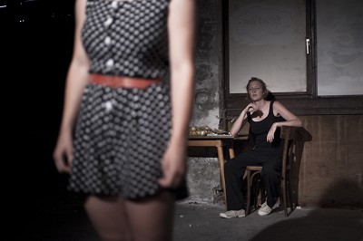 Zelfbeschuldiging - © Tom Callemin | Naast de mononomaden zijn er de stereonomaden met Jong Theater. Geen monologen op deze route, maar twee producties met protagonisten en antagonisten op de scène. Urland, House on Mars:Pixel Rave De avond voordien zag ik jong werk van Urland. Het begin van hun House on mars:pixel rave belooft veel. Een man met mooie stem geeft in het Engels spitant uitleg over de realiteit in moleculen en de virtuele realiteit in pixels en weet op de fantasie van de toeschouwer in te spelen. Ieder ziet immers iets anders in een beschrijving (ieder maakt zijn eigen film bij het lezen van een boek) maar ook de manier waarop je iets verteld wordt, geeft richting aan je kijken. Dat alles wordt aardig uitgelegd en geïllustreerd. Maar dan krijgen we het lange voorbeeld van de voorstelling, met menselijke wezens in futuristische pakken, met veel rook, geknetter, lichteffecten, met schel versterkte en vervormde stemmen, in een B-filmstijl. Voor mij werden de Amerikaanse strips uit de jaren 50 en 60 nu driedimensionaal. Wel leuk, maar er wordt niets meer mee gedaan. Alles blijft eendimensioneel en monotoon, alles blijft in één laag, en dan komt de wel bedoelde humor niet over. Het blijft hangen in technobeats en bundeltjes laserstralen. Robbert&Frank/Frank&Robbert/Campo, A journey into Space Ik was dan ook bang dat de eerste van de stereonomaden op hetzelfde zou uitdraaien. Ook hier weer een verhaaltje in Amerikaans Engels, ook hier weer een verhaaltje over een virtuele gepixelde reality, ook hier weer acteurs in futuristisch aandoende outfits. Maar het moet gezegd, A journey into Space kent een wat leukere verhaallijn, de humor en de situaties zijn bijwijlen lekker absurd, de animatiefilm is beter en grappiger. Robbert & Frank hebben een vogel en een olifant van papier in elkaar gevouwen, spelen rare Amerikanen, animeren met digitaal beeldspeelgoed, laten een tuinkabouter over de scène rijden, projecteren op de vloer lijnen en figuren, transformeren in 'aliens' die seksueel geobsedeerd zijn. Met veel beat, auditieve en visuele effecten. Vermoeiend grappig. Tuur Marinus/Busy Rocks, Still Animals Als verademing kregen we dan een dansvoorstelling. Van de Busy Rocks, een collectief dat bestaat uit vijf afgestudeerde PARTS-studenten onder leiding van Tuur Marinus. In pure eenvoud, zonder enige pretentie, zonder allerlei technische snufjes en ingrepen. Alleen het lichaam telt, het lichaam dat in verschillende 'dier- en mensmachine'-standen in beweging wordt gebracht. Een of twee dansers in het zwart zetten een derde danser op hun voeten en laten hem bewegen. Dat kan gaan van zwembewegingen naar kikkersprongen en konijnenpassen. Trage golvende tableaux vivants. Een danser in het zwart houdt een lichaam vast en dat begint dan boven de vloer hardloopbewegingen te maken. In een ander tafereel zijn ze met drie zichtbare lichamen, dan weer met twee of alleen. Variaties op het thema van dier- en mensbewegingen worden getoond. Het lijkt een speels vervolg op de fotografische en filmische bewegingsontledingen van Edward Muybridge van begin vorige eeuw. Aandoenlijk charmant. Nona Buhrs & Aurelie di Marino, Zelfbeschuldiging Een paar verdiepingen hoger in de grote kunstenaarsloods zitten twee vrouwen in een hoekje aan een tafel een berg uien verbeten te snijden. Ze huilen, allicht, maar ze willen ook wel lachen. Met hun knikjes en glimlachjes naar het publiek willen ze zich als het ware verontschuldigen voor hun gedrag. Dat aureool van gedwongen huilen en dat tegelijkertijd weglachen hangt over de hele productie en maakt ze ook bijzonder. De twee spelers hebben het spreekstuk Zelfbeschuldiging van Peter Handke compleet naar hun hand, of beter naar hun monden en lichamen gezet. Zelfverwijten zijn het van dingen die de 'ik' niet gedaan heeft, verontschuldigingen voor handelingen die de 'ik' wel gedaan heeft, wisselen elkaar af. Die lange opsomming weten de twee actrices verbaal en fysiek boeiend en confronterend te maken. De flamboyante Vlaamse Aurelie di Marino en de Nederlandse Nona Buhrs kaatsen de 'ik-zinnen' naar elkaar, de ene keer heel heftig, kwaad, boos, de andere keer twijfelend, kwetsbaar, verontschuldigend. Ook in hun fysiek spel dagen ze elkaar uit. Het schelle gesnerp van de meeuwen en het lijzige gejank van de visdiefjes resoneren in de zolderruimte en vervolmaken deze pittige en krachtige boetedoening en klaaglitanie. Knap. Info: www.theateraanzee.be