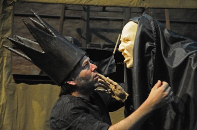 Als Jan Maillard van Theater Froe Froe een productie maakt, is ze altijd minder absurd en meer serieus dan het werk van zijn broer Marc Maillard. Het doet er niet toe of het een bewerking is van een klassieker of puur eigen werk, bij Marc nodigt het vaak hilarisch absurdistisch inventief spel tot grinniken en lachen uit, bij Jan zit er meer ernst en een streven naar poëzie in zijn stukken. Marc's figurentheater in het klein en groot draagt meer de stempel van Froe Froe, terwijl Jan's klassieke bewerkingen en zeker die in de openlucht existentiële thema's helder en in alle schoonheid willen etaleren. Jan blijft veel meer bij de oorspronkelijke tekst, heeft een groot respect voor de auteur, en zeker voor Shakespeare. Ik denk aan Midzomernachtsdroom van een paar jaar geleden in de openlucht, en nu ook Macbeth dat onder een droge nachtelijke hemel op Theater op de Markt in Hasselt in première ging. Theater in de schemering. Het heeft iets mysterieus, zeker als er nog rook gemaakt wordt die zweeft uit de grote 'poppenkast', tussen de volle bomen, over een groot speelveld met vuurkorven en onder dreigende melodieuze celloklanken, live gebracht door Simon Lenski van DAUU. (Helaas werden die op de première gestoord door het lawaai van het Kapermolenconcert een honderd meter verder. Gelukkig konden de boxen van Froe Froe wat luider gezet worden.). De cellist zit hoger dan het speelvlak, bepaalt muzikaal en visueel het ritme van het spel. Een spel dat zich afspeelt naast en voor hem en opzij in een grote poppenkast. Met kleine en grote poppen en mens-personages. Het wordt een spel van groot en klein. Koning Duncan is heel groot, (hij wordt gedragen door drie spelers), hij is machtig, en in zijn tevredenheid kan hij de beminnelijke vader spelen. Hij heeft alles onder controle, maar wat verderop zal een heks een voorspelling aan Macbeth en Banquo doen die alles zal veranderen. Eerst doolt het 'woudwijf' in de kast rond, in het klein, daarna stapt ze uit de kast, levensgroot, krom, etter spuwend. Zoals ook andere personages mensengroot in de kast stappen, in het klein verschijnen en er weer in reële grootte uitkomen. Het verhaal kent in deze bewerking grote sprongen. Lady Macbeth gaat al snel over van aimabele echtgenote naar een machtsgeile vrouw, die zich niet laat afschrikken door een moord meer of minder. Als poppetje is ze klein, danst ze in de toren met een agressief venijn dat ze als mens-personage met woorden zal camoufleren en in moord zal omzetten. De Shakespeareaanse taal is behouden, poëtisch wordt het thema van machtshonger ingekleurd. Het is geen god die de mensen al dan niet aan zichtbare draadjes laat bewegen zoals hij wil, het is geen tiran die zijn onderdanen als poppen manipuleert naar zijn hand, het is een idee, een waanidee, een dogma, een credo dat de mens tot pop reduceert. Het is het blind vertrouwen in die idee dat Macbeth en zijn vrouw manipuleert en hen daden laat verrichten die onmenselijk zijn. Zij zijn bezeten door een ideologie, ze zijn niet meer zelf verantwoordelijk voor hun daden, ze wassen hun handen in onschuld. Het idee-fixe in macht leidt tot een gevecht tussen groot en klein, met als speelbal de mens. Niet alleen de macht zelf, maar de machtsgeilheid maakt de individuele mens groot én klein. In macht groot willen worden, als persoon klein blijven. En dat gebeurt geleidelijk, bijna onzichtbaar, zoals het mens-personage overgaat in de pop en dan weer naar mens. In ons toeschouwer-zijn worden ook wij gemanipuleerd. We gaan mee in het theater, in de machtshonger, en weten nog wel dat de pop een uitbeelding is van het personage, maar vergeten dat het personage ook maar een acteur is die speelt. Ook op dat niveau is er sprake van manipulatie: "Een arme speler die op het toneel een uurtje puft en kwaakt en dan hoort ge hem niet meer." Theater Froe Froe speelt die manipulaties naturel uit, ingetogen, in eenvoud en zonder effectbejag. En dat maakt indruk. Info: www.froefroe.be