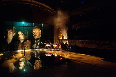 De Middeleeuwse fabel van de sluwe rovende en dodende vos die door koning Nobel is gedagvaard maar de dans ontspringt, is al vele keren bewerkt en herschreven. Iedere tijd, elke generatie herkent een eigen vos en telkens komt de vraag of wolf, beer of enig ander roofdier wel anders is dan de vos. Het dierenrijk is nog altijd een symbool voor het menselijk handelen, dat in misdaad en straf evenzeer verwijst naar de vos in de mens. Van den vos, gesteund door het Toneelhuis en Muziektheater Transparant en onder meer ook door het Cultuurprogramma van de Europese Unie, is niet een zoveelste bewerking van het bekende gegeven, het is een Gesamtkunstwerk dat tot stand kwam door bundeling en integratie van (binnen- en buitenlands) artistiek talent uit verschillende disciplines: theatercollectief FC Bergman, Josse De Pauw (tekst), Liesa Van der Aa (hier als violiste en co-componiste) en het Berlijns genre-crossing Solistenensemble Kaleidoskop. Live camerawerk en live muziek, beweging, woord en bezinning nemen niet enkel de scène in beslag maar ook de gehele benedenruimte van de schouwburg. De zitplaatsen zijn verwijderd om plaats te maken voor een mondain zwembad waarvan het water de ruimte ‘zuivert’, een enscenering die een schril contrast vormt met de gebruikelijke scène die voor de gelegenheid in een jungle is omgetoverd: van een hedendaags beschavingsitem naar een woud van oerdriften is maar een kleine afstand. Het publiek is naar de balkons verwezen en is getuige van het schouwspel van uit een eerder bevoorrechte positie, alsof je van op het balkon van een appartementsgebouw kijkt naar wat er beneden op de straat gebeurt. Een cameraman zorgt daarenboven voor de nodige beelden, zoals men het gewoon is geworden dat de televisie elke avond zonder scrupules verslag uitbrengt van het wereldwijde geweld. Bereikt een reportage in de media vooral passieve kijkers of luisteraars, het bekijken van een kunstzinnig gebeuren creëert bij de kijker/luisteraar meerdere gevoelens. De meerwaarde van Van den vos zit dan ook in het creëren van een tijdloos evenement met opheffing van het traditioneel schouwburggevoel waarin het wordt gerealiseerd. Hopelijk krijgt deze vorm-doorbrekende productie tijdens de geplande Europese tournee in 2014 ook alle kansen om die meerwaarde telkens weer te bevestigen. Het lijk van een jonge vrouw wordt uit het water gehaald door zwijgende wetsdienaren. Een inspecteur (Dirk Roofthooft) gaat in discussie met het establishment (Viviane De Muynck) en zal de seriemoordenaar doen opsporen. Het wordt een uitgesponnen verhaal, met afwisselend afstandelijk geacteerde scènes in het bos en rond het bad. De dramatische handeling die zich op verschillende niveaus afspeelt wordt in kleurrijke beelden doorgegeven en krijgt vleugels door het buitengewoon indringend effect van de muziek. Na enkele experimenten, door het collectief FC Bergman zelf beschouwd als ‘anarchistisch en licht chaotisch, vooral extreem beeldend en poëtisch’’ is Van den Vos voor het collectief weer een stap verder in het doorbreken en afbreken van gevestigde opvattingen. Dit verrassend kunstenatelier van beeld en muziek is geslaagd. Het woord fungeert minder krachtig, maakt minder emoties los, maar krijgt op het einde van de voorstelling alle eer in het lied, waarin de kern van het stuk is samengevat: ‘maak een einde aan dit slopend verhaal/van gal en spuug, verdraaide taal/van walg en meug, verwrongen moraal/maak er een einde aan, trek het mes! Info: www.toneelhuis.be, www.transparant.be, www.fcbergman.be