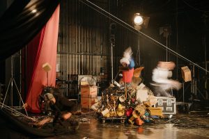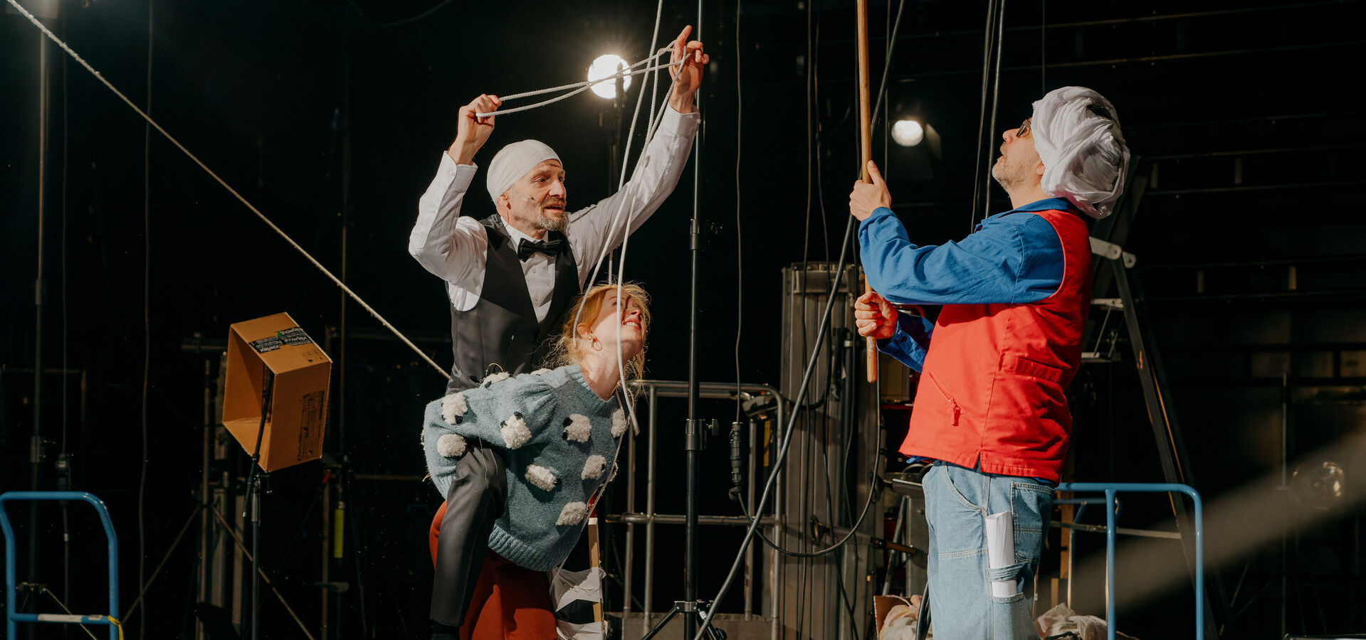 Als je de ‘grote zaal’ van hetpaleis in Antwerpen binnenkomt, zie je dat het halfduistere podium vol rommel staat: planken, stokken, netten, doeken… En ook een buffetpiano, die zo te zien zijn beste tijd wel gehad heeft. Een kalende man, gekleed in een deftige zwarte outfit, een kelner of zo met een witte servet over zijn arm, richt zich tot de zaal maar gaat plots een discussie aan met iemand die langs de côté jardin de toeschouwersruimte wilde binnenkomen. Je ziet die persoon niet direct, maar een meisjesstem zegt dat ze gevraagd is om in het theater een liedje te komen zingen. De kelner beweert dat dit een vergissing moet zijn, omdat hijzelf gevraagd is om een kamp te bouwen. Het meisje mag van hem na wat aandringen toch binnenkomen, waarna blijkt dat ze heel sportief is, regelmatig op de scène haar ‘radslag’ oefent (een acrobatische figuur bij het turnen), en bovendien ook nog een aardig stukje piano kan spelen. En dan zijn ze plots met drie, want een derde persoon was ook al op de theaterscène aan het rondlummelen, een rare kwast die niet zoveel te zeggen heeft maar die af en toe wat rare pasjes maakt op het (begeleidend gesproken) ritme van ‘ramsamsam’.